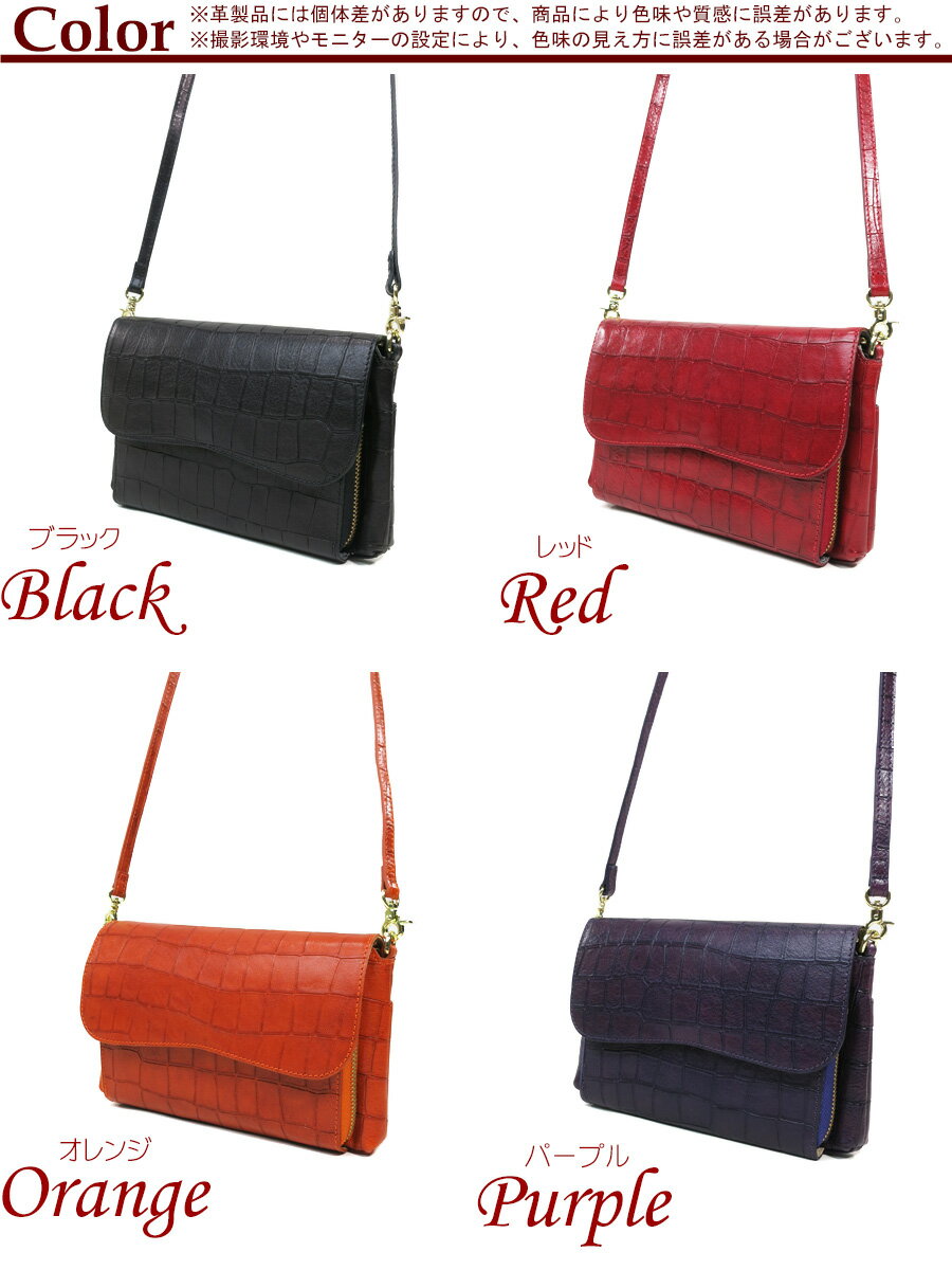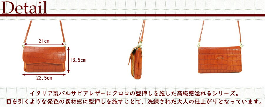 商品詳細 商品番号 SZKM-52 バッグ仕様 ■サイズ(概寸表記) タテ13.5cm×ヨコ22.8cm×幅3.5cm ■重さ 392g ■本体開口部 18cm ■ポケット(計2つ) ○外ポケット:1つ タテ8.5cm×ヨコ21cm(裏面ポケット) ○内ポケット:1つ ■ショルダーストラップ 幅:1cm 長さ:123cm〜135.5cm 高さ:61cm〜67cm ベルト式(5段階調節) 財布仕様 ■札入れ 4ヶ所 ■小銭入れ 1ヶ所(中央オープンポケット) ■カードホルダー 12枚分 カラー 〇ブラック 〇レッド 〇オレンジ 〇パープル 素材 イタリアンレザー(牛革クロコ型押し) 原産国 素材:イタリア 縫製:インド 特徴 イタリア製バルサビアレザーにクロコの型押しを施した高級感溢れるシリーズ。